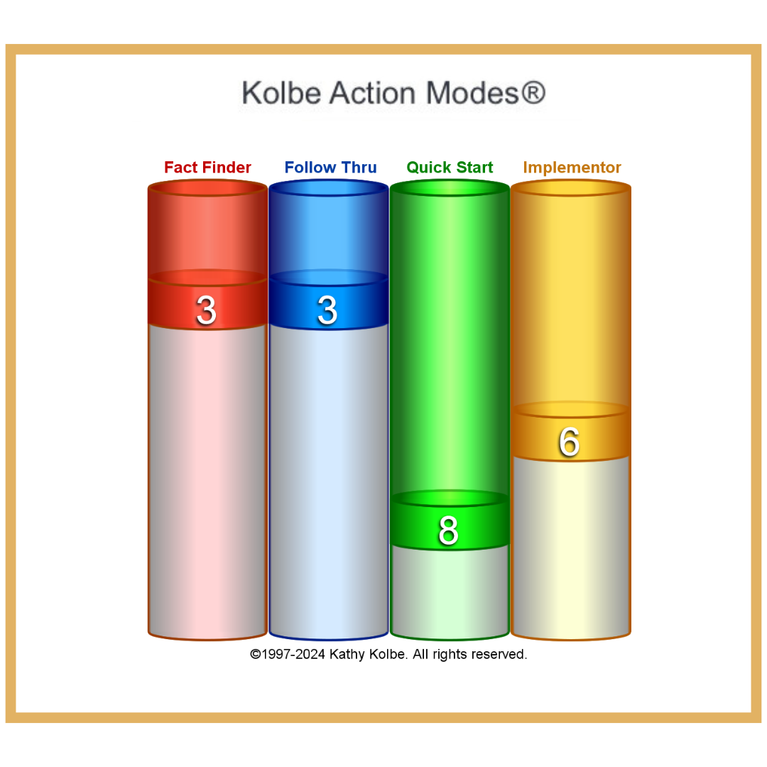 The Kolbe A Index™ reveals your “zones of genius” across four key modes (rated 1–10) that guide your instinctive strengths: